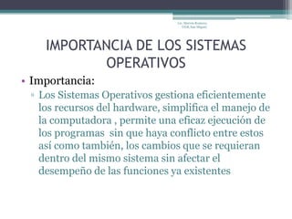 El sistema operativo es el software que permite a los usuarios interactuar con la computadora y gestionar los recursos del hardware. Se encarga de administrar la memoria, el procesamiento, el almacenamiento y la entrada/salida de datos. Los sistemas operativos pueden ser de código abierto o propietarios, y se caracterizan por ofrecer una interfaz de usuario para interactuar con la máquina.